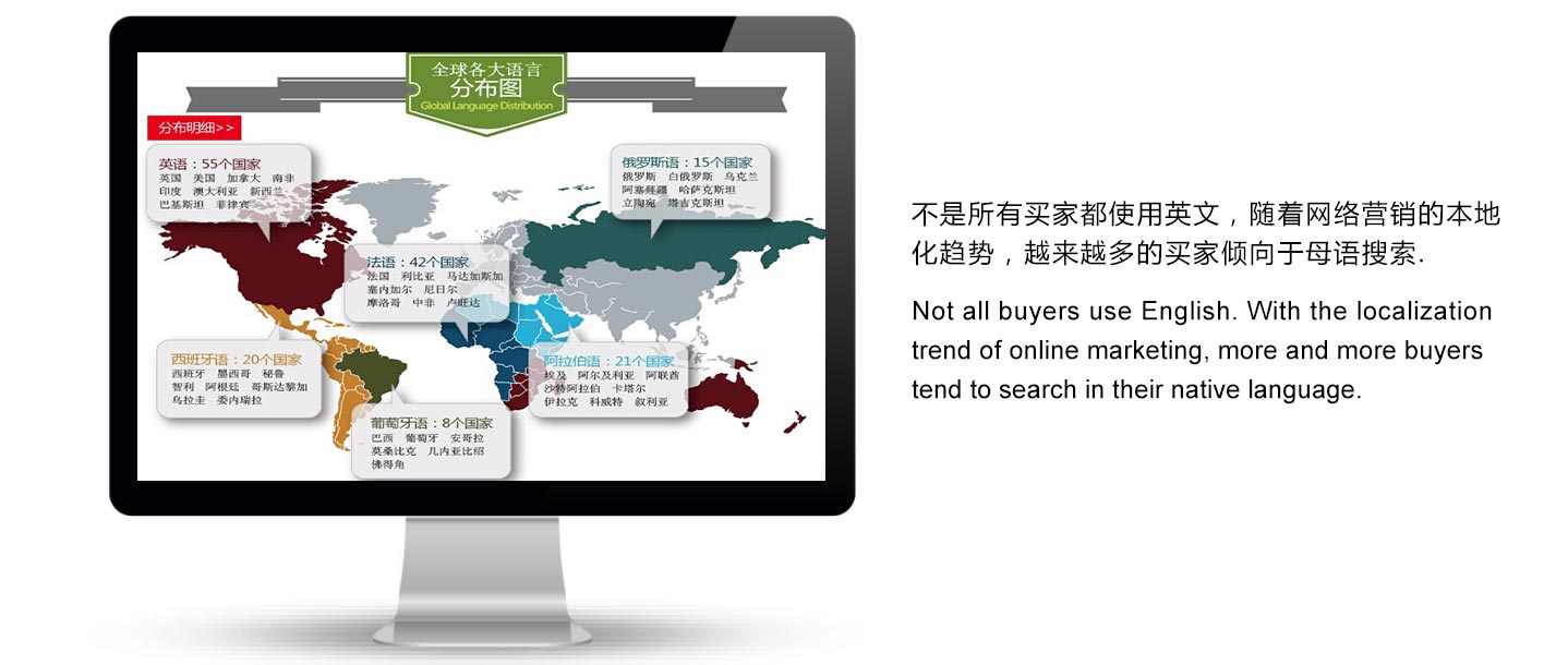 不是所有買家都使用英文,隨著網(wǎng)絡(luò)營銷的本地化趨勢,越來越多的買家傾向于母語搜索